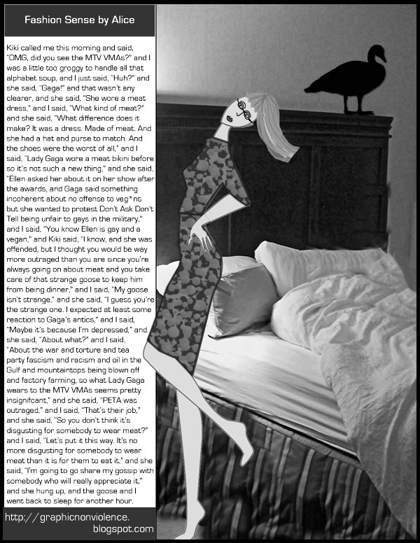 Lady Gaga created quite a stir by wearing a meat dress to the MTV VMA awards, but here at Fashion Sense we're not sure that's any more disgusting than eating meat is. [The text reads: 'Kiki called me this morning and said, “OMG, did you see the MTV VMAs?” and I was a little too groggy to handle all that alphabet soup, and I just said, “Huh?” and she said, “Gaga!” and that wasn’t any clearer, and she said, “She wore a meat dress,” and I said, “What kind of meat?” and she said, “What difference does it make? It was a dress. Made of meat. And she had a hat and purse to match. And the shoes were the worst of all,” and I said, “Lady Gaga wore a meat bikini before so it’s not such a new thing,” and she said, “Ellen asked her about it on her show after the awards, and Gaga said something incoherent about no offense to veg*ns but she wanted to protest Don’t Ask Don’t Tell being unfair to gays in the military,” and I said, “You know Ellen is gay and a vegan,” and Kiki said, “I know, and she was offended, but I thought you would be way more outraged than you are since you’re always going on about meat and you take care of that strange goose to keep him from being dinner,” and I said, “My goose isn’t strange,” and she said, “I guess you’re the strange one. I expected at least some reaction to Gaga’s antics,” and I said, “Maybe it’s because I’m depressed,” and she said, “About what?” and I said, “About the war and torture and tea party fascism and racism and oil in the Gulf and mountaintops being blown off and factory farming, so what Lady Gaga wears to the MTV VMAs seems pretty insignifcant,” and she said, “PETA was outraged,” and I said, “That’s their job,” and she said, “So you don’t think it’s disgusting for somebody to wear meat?” and I said, “Let’s put it this way. It’s no more disgusting for somebody to wear meat than it is for them to eat it,” and she said, “I’m going to go share my gossip with somebody who will really appreciate it,” and she hung up, and the goose and I went back to sleep for another hour.']